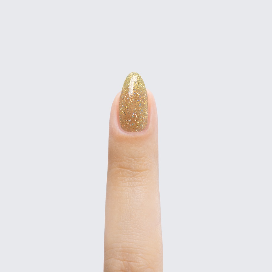 The gold, iridescent sparkle of this translucent polish is a treasure to behold.